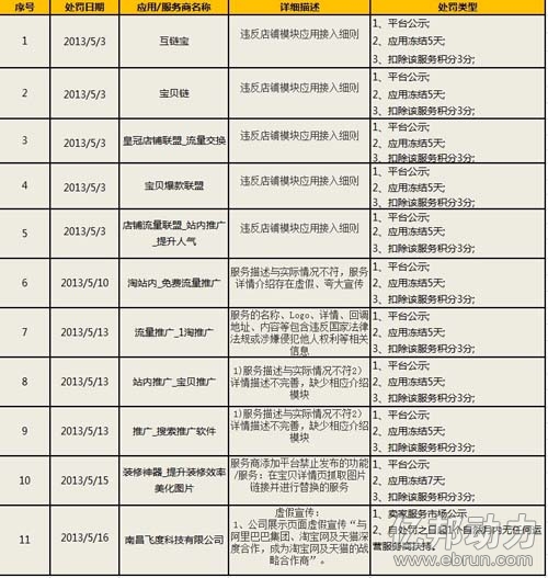 【亿邦动力网讯】5月22日消息,亿邦动力网获悉,淘宝开放平台日前公布了5月份处理违规服务商的名单。统计结果显示,截至目前,共有11家服务商或淘宝卖家因违反不同的规则遭受处罚,最严重者被判定1个月内暂停任何服务支持。